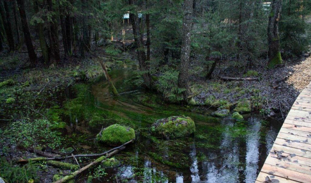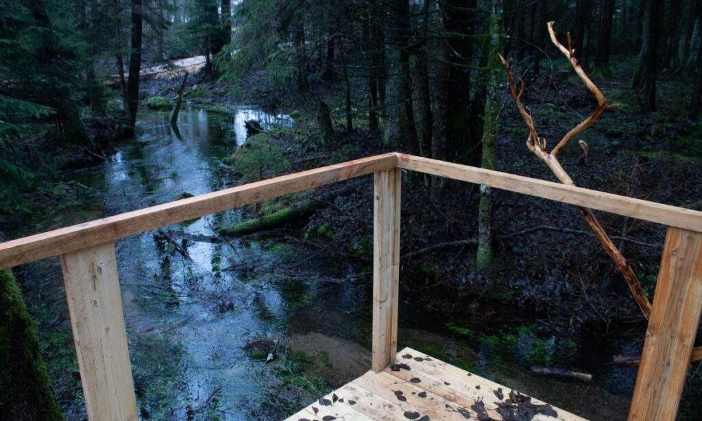 Прогулка по лесу по оборудованной тропе с деревянными настилами и мостиками через ручей;