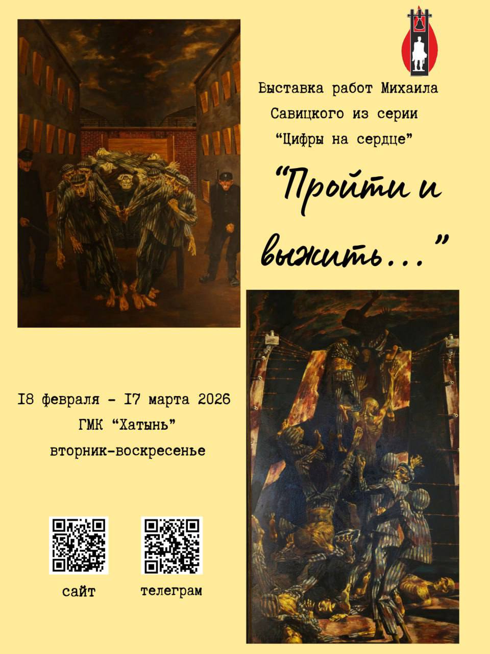 С 18 февраля по 17 марта 2026 года в мемориальном комплексе Хатынь будет работать выставка «Пройти и выжить…», приуроченная ко дню рождения выдающегося белорусского художника Михаила Савицкого. В холле музея будут представлены репродукции работ мастера из знаменитой серии «Цифры на сердце».